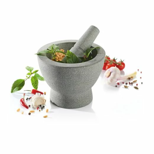 Ideal für die Zubereitung von frischem Pesto oder Kräuterpasten ist der große Granit-Mörser mit Granit-Stößel.