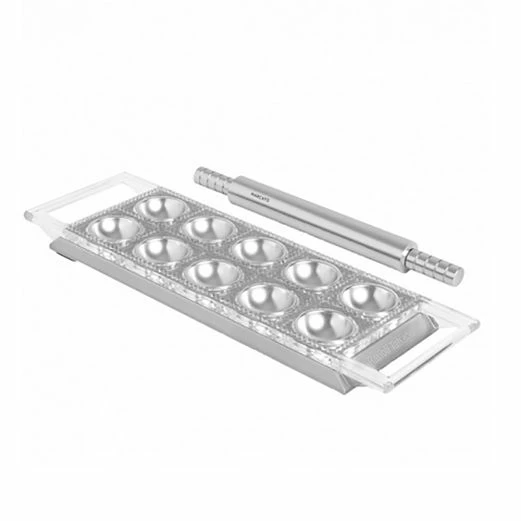 Auf einfache Art und in wenigen Minuten können dank der abnehmbaren oberen Platte, mit der ein sauberer Schnitt ausgeführt wird, in einem Vorgang 10 Ravioli geformt werden, die man dann auf eine Platte legt, bis man sie kocht.