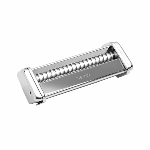 Das Zubehör Trenette ist eines der 13 Zubehörteile für frische Nudeln, die mit der Nudelmaschine Atlas 150 kompatibel sind. Sie können es mit der dazugehörigen Handkurbel von Hand oder mit dem Motor Pastadrive verwenden. Die Trenette sind ein quadratisches Nudelformat mit einer Breite von 3,5 mm. Die empfohlene Stärke des Teigblatts ist die Reglerposition Nr. 6 auf der Nudelmaschine.